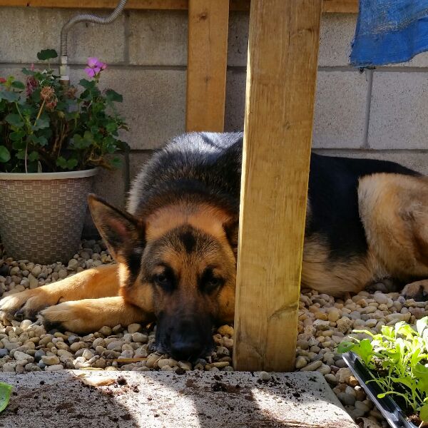 Baron found the coolest spot in the greenhouse today